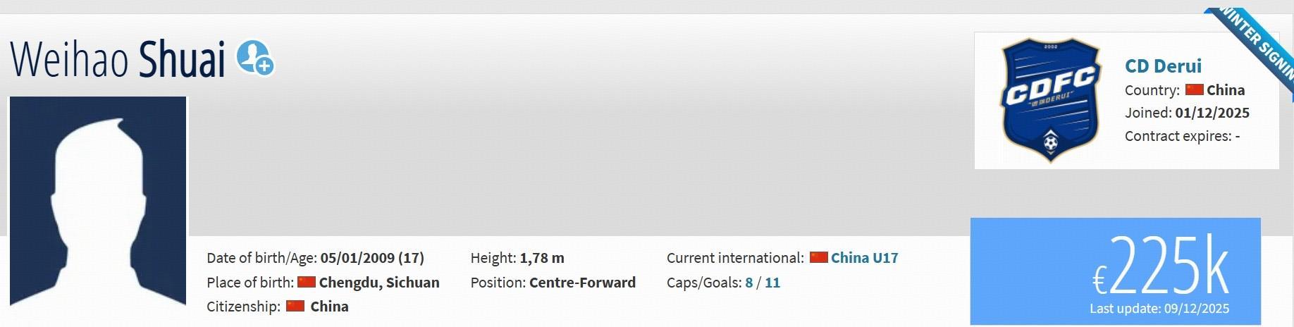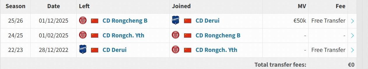 据德国转会市场网站更新,成都蓉城小将帅惟浩目前的所属权已由成都蓉城变为成都德瑞。